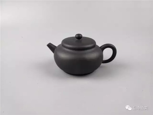 此壶以乌泥为胎,胎身呈乌黑色,壶身表面细腻,造型古朴,溜肩饱满,平盖平底。