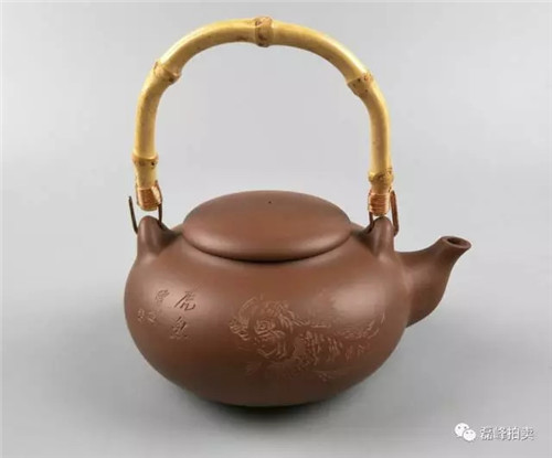 此作品继承曼生大师“画龙点睛”。壶身题“云霞烟雨现苍龙,点睛飞腾变化中,撒作甘霖能济旱,九州四海乐年丰”。泥取紫泥调砂,格调高古。