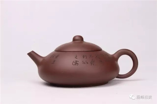 此壶为摹古之作,曼生壶式中经典的款之一。壶体造型简约,线条流畅。直流蓄势而拔,尽显别致,圈把浑而有力。壶身作曼生铭文,洒脱自然,气韵极佳。