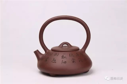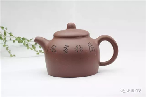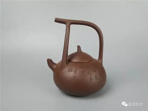 此壶矮梨式壶身,椭圆形圈把,色泽圆润,器形丰满,光泽温润古雅,手感舒适自然,形制古朴大度。流、把挺括有神韵,铭款精致灵秀,功力不凡。