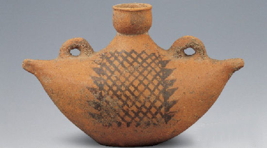 此船形彩陶壶为盛水器,属于随身携带的水壶类物品。壶身形似菱角,顶部有杯状壶口,两个圆环形器耳分列于两侧肩部。在壶口下方、器耳之间的壶体侧面以黑彩绘制网格纹,网格的两侧还有鱼鳍状的三角形纹饰等。陶壶造型由仰韶文化常见的小口尖底瓶转化而来,基本是将纵向的瓶身横置并稍加变形,将瓶口移到壶身的中央,再将本位于瓶身两侧的对称双耳移到壶身的肩部而成。陶壶两端如船形上扬,尤其是壶身装饰网纹,极似从河里收网捕鱼或者捕鱼结束将网搭在船边晾晒的情景,从造型设计到装饰纹样,都让人联想到渔船、渔网、捕鱼活动等水上生活场面。