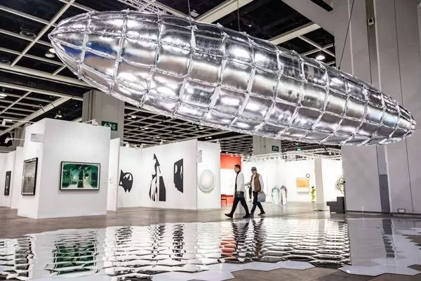李昢的超大型装置“Willing To Be Vulnerable – Metalized Balloon”呈现了一艘十米长的齐柏林飞船复制品。(图片来源:巴塞尔艺术展香港展会)