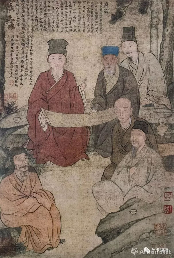 此画像作于清顺治九年(1652年),乃追忆作者往昔与时贤交游、品画情景。画中描绘的场景,未必是真实发生过的现场,或为作者虚构。画中所写人物,项圣谟时年四十,则画中所描绘的时间,当为明崇祯九年(1636年)。以此类推,董其昌时年八十有二,这一年的十二月七日,董其昌即驾鹤西去,故此画像是目前所见董其昌最晚年的形象。据李铸晋《项圣谟〈尚友图〉》一文所载,在美国迈阿密大学罗尔美术馆也收藏了一件同题材的《尚友图》〔2〕,但尺幅稍大。或上博本为稿本,美国本为成本。画中董其昌居中,身着红衣,所处的位置显示其在当时画坛祭酒的地位。清人潘世璜(1764—1829)在其《虚静斋云烟过眼录》中记载有一件《尚友图》:“二十八日,唔毛一亭,叔美出示书画数种,内项圣谟《尚友图》,图有思翁、眉公五人,自题帧首,小楷极精。”〔3〕“叔美”为钱杜(1764—1845),书中提及之《尚友图》与上博本和美国本均相吻合,但究竟是指哪一本,或另有其本,则没有更多信息佐证。