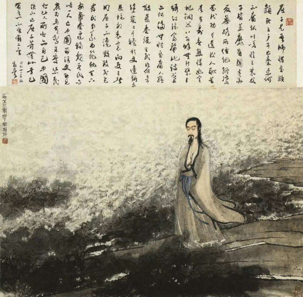 此外,他还将1942年郭沫若于旧作《屈子行吟图》的题诗,从原画上截取,重新装裱在这幅新画上,书画交融,书以画名,画以书名,成为一时的美谈。