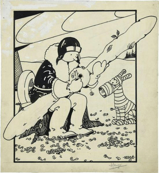 在漫画家埃尔热的这幅作品中,“年轻记者”丁丁坐在树桩上,替他的飞机雕刻临时螺旋桨,原有螺旋桨在飞机猛烈降落时损坏;丁丁的忠实伙伴小狗白雪全身绑着绷带,蹲坐在一旁观看。