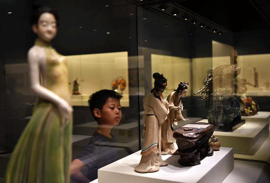 一名小观众在观看《金陵十二钗》组塑中的《惜春作画》