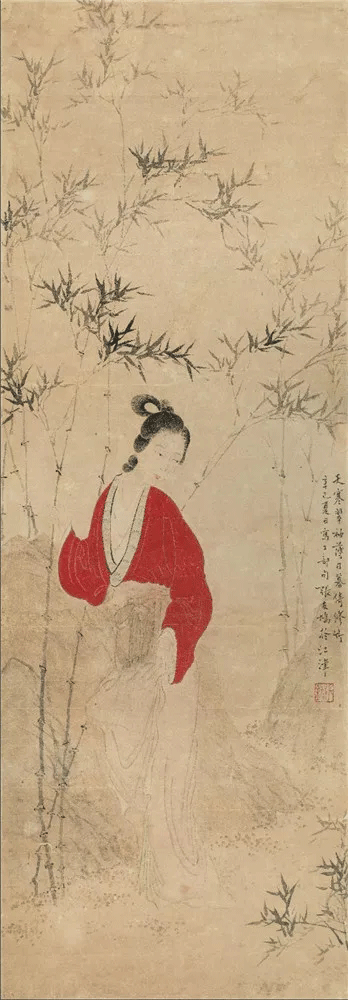 张友鸠擅画工笔仕女,她的《红衣仕女图》的题款、杜工部诗句“天寒翠袖薄 日暮倚修竹”是张肇铭先生写的。此画作被入选进民国第三次全国美展,后又被遴选去新疆甚至印度展出。