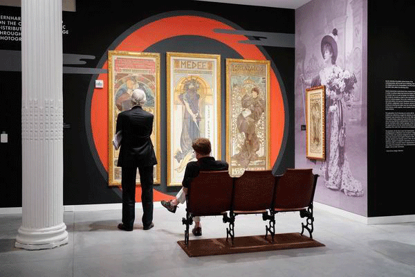 开馆展览旨在混合呈现众所熟知的海报及新的海报。在两个主展中,较大的那个是“阿尔丰斯·慕夏:新艺术风格/新女性(Alphonse Mucha: Art Nouveau/Nouvelle Femme)”,将焦点放在捷克艺术家慕夏及其绚丽的新艺术风格图像上。慕夏(1860-1939)创作的作品捕获了女性优雅的气质。(展览中的大多数海报都借展于布拉格的Richard Fuxa基金会。)