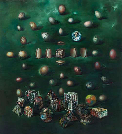 雅昌艺术网: 有一些像生物、魔方、攀岩石的元素在你这次的作品中反复出现,这是有什么考虑呢?