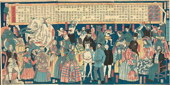 那些矛盾的图像在很大程度上是日本艺术家们翻阅《伦敦新闻画报》的结果,它从怡和洋行被分发到横滨各地,这份刊物展现了名人胜地与重要事件的版画,比如丹麦的宫殿、英国的教堂、印度的塔楼,以及美国的蒸汽船,它们为展出的这些木刻版画带来了灵感。日本当权允许人们与西方的接触有限,艺术家们渴望满足由此而产生的无尽好奇心,为此而牺牲了准确性。事实上,异想天开的想象常常取代了仔细的观察,比如在落合方几的《万国男女图》中,美国人的旁边是“没有肚子国”“长腿国”以及“长臂国”的国民。一些如今我们习以为常的画面,在当时日本的语境下则具有异国情调,比如,一名美国女子骑在马背上,这对于19世纪的日本来说是性别上的“失格”。