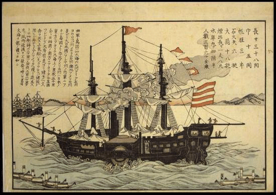 这些版画中关于美国的图像在描述了日本与西方相遇后的种种情形。它们告诉我们,许多日本人在和不同的文化相遇时既感到恐惧,又充满期待。在一幅佚名画家的《保厄坦》中,描绘了海军军官马修·佩里(Matthew Calbraith Perry)的旗舰,这艘黑色的大船看上去非常危险,似乎将日本小船都挤到了画面的角落里。而在另一幅19世纪50年代佚名画家的版画中,佩里本人看起来就像个怪物,长着一只大鼻子,嘴巴紧绷着,下巴有好几个。在画的背景中,可以看到各种战士的帽子,其中一顶带有羽毛,有些失真,却将当地人对于一支强大而先进的军队登陆日本海岸的恐惧展露无遗。