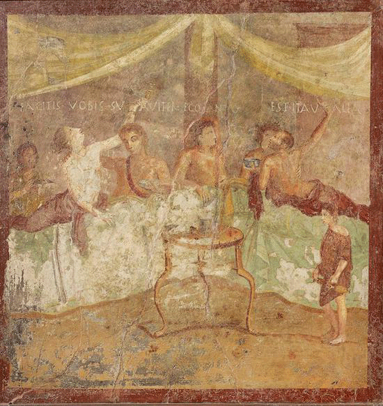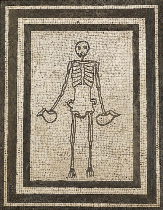 然而,他们确实对死亡本身有着强烈的认识。饮食行为伴随着死亡率的提醒,骷髅的象征有时被用来装饰盛宴杯和餐厅本身。在展览的尾声部分,在庞贝的餐厅地板中心可以发现了一块马赛克图像,现在看起来非常有先见之明:它描绘了一只全长的人类骨架,每只手拿着一个酒壶。