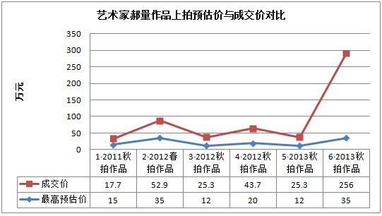 值得注意的是在最近一次2013年香港蘇富比秋拍,也是最高价格作品出现的这一次,出现了成交价高出预估价631%的比率。如图所示纵观拍卖纪录,成交价明显高于预估价的走势也显示了藏家对于作品持有的极高热度。从艺术家整体创作数量及市场流通来看,目前在二级市场流通的全部是艺术家没有和画廊合作之前(2011年之前)的作品,之后的作品几乎没有出现过,作品流通性并不看好,拍卖市场仍有虚高的成分。