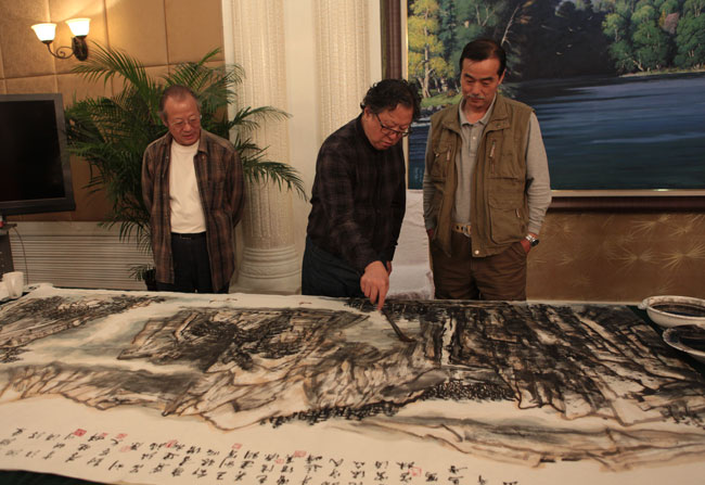 10月8日晚,“中国画•画中国——二画新疆”全国知名画家写生团成员齐聚新疆乌鲁木齐市红山宾馆,新疆自治区文化厅举行了欢迎晚宴。这是中国文化传媒集团落实中央第四次援疆会议精神的第一个项目。中国文化传媒集团党委副书记杨守民、新疆维吾尔自治区文化厅副厅长柯尼斯•尼杉、新疆自治区党委机关工委宣传部部长王相君、中国美术院常务副院长沉浮、同曦集团常务副总裁、新疆自治区文化馆馆长吾甫尔•买提尼亚孜等领导出席了欢迎晚宴。杨守民副书记、柯尼斯•尼杉副厅长、副总裁副总裁分别发表了热情洋溢的讲话,沉浮副院长对这次参加活动的画家们逐一作了介绍。副总裁副总裁表示:我们对援疆工作十分支持,将来三画新疆、四画新疆,同曦集团一直是“中国画•画中国”系列活动全力支持的后盾。晚宴后,画家们情绪高昂,纷纷挥毫泼墨,已八十多岁高龄的著名山水画家李宝林先生率先开笔,提按顿挫间,一幅精美山水画已逐渐雏形。10月9日上午,新疆维吾尔自治区文化厅厅长穆合塔尔•买合苏提专程赶来为写生团送行,并对这次活动给予高度赞扬:你们的援疆工作做的具体、扎实。我们欢迎你们的到来,这对新疆的文化建设起到积极的推动作用。来自北京、河北、广东、新疆、安徽、湖南等地的艺术家约20人应邀参加了该活动,他们分别是:李宝林 中国美术家协会会员,中国国家画院国画院副院长,中国美术家协会河山画会会长邓维东 中国美术家协会理事,新疆美术家协会主席沉 浮 中国美术家协会会员,中国美术院常务副院长曹传真 中国美术家协会会员,中国美术院行政副院长于云涛 中国美术家协会会员,新疆建设兵团美术家协会主席郐振明 中国美术家协会会员,新疆美术家协会副主席兼秘书长包信源 中国美术家协会会员,江苏省动漫艺术家协会副主席兼 秘书长刘 原 中国美术家协会会员,珠海中国城市山水画研究会会长康书增 中国美术家协会会员,新疆美术家协会副主席肖映川 中国美术家协会会员,广东省美术家协会副主席陈卫建 中国美术家协会会员,石家庄市美术家协会副主席封学文 中国美术家协会会员,马鞍山市新徽画院院长汪 涛 中国美术家协会会员,安徽省安庆书画院院长王利军 中国美术家协会会员,海军政治部创作室专业画家吴建科 中国美术家协会会员,海军政治部创作室正师职创作员吕绍福 湖北省美术院一级美术师新疆维吾尔自治区是举世闻名的歌舞之乡、瓜果之乡、黄金玉石之帮。新疆幅员辽阔、地大物博、山川壮丽、瀚海无垠、古迹遍地、民族众多、民俗奇异。在这片广袤的大地上,冰川雪岭与戈壁瀚海共生,高原山水景观蕴含在天山、昆仑山等世界名山之中。有着众多的雪域冰川、叠嶂雄峰、飞泉瀑布、珍奇异兽。这里有海拔8600米的世界第二高峰,又有低于海平面154米的中国最低洼地,既有一泻千里的河流,万顷碧波的草原,又有光怪陆离的戈壁幻境,神秘莫测的沙漠奇观。保存完好的原始动植物种群,更显出得天独厚的大自然的本色。这里的土地富饶而美丽,广袤而神奇。这里的人民热情好客,淳朴豪爽。