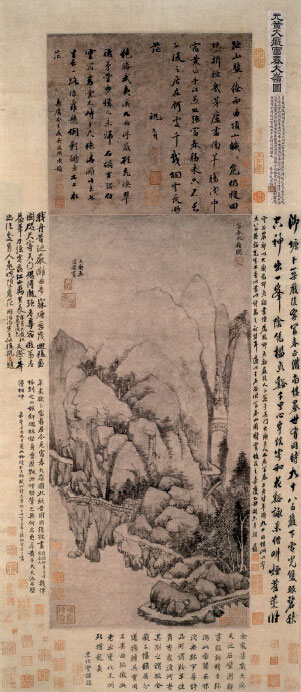 展品中有20余件宋元作品,件件堪称国宝,其中来自故宫的一套《名笔集胜册》是首次展出,汇集了十几幅宋代山水、花鸟作品,画家抽取了大自然的动人瞬间,从中可以一窥宋代绘画的精妙。来自上博的《丹山瀛海图》是元四家之一王蒙的经典名作,描绘海中仙山瀛台的壮丽奇伟,景色奇丽,意境开阔。而南博所藏的《富春大岭图》则于几年前赴台湾参加《富春山居图》合璧展,是黄公望的代表作。