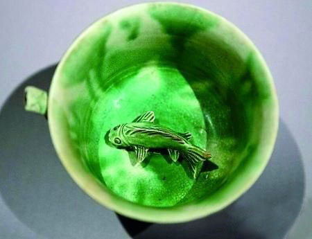 从“黑石号”沉船上打捞起的白釉绿彩鱼底吸杯