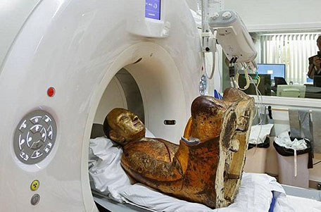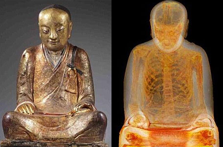 研究者们在荷兰对其做完CT扫描及内镜检查后,发现这具和尚木乃伊的内脏已被掏空,其体内藏有写着汉字的纸张。随后,佛像被护送至匈牙利一家博物馆,将展出至2015年5月。