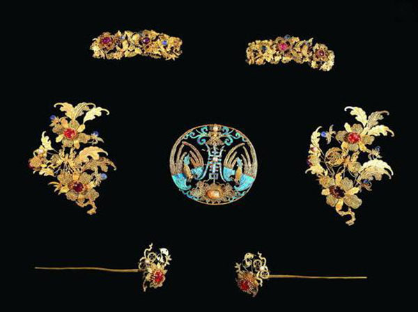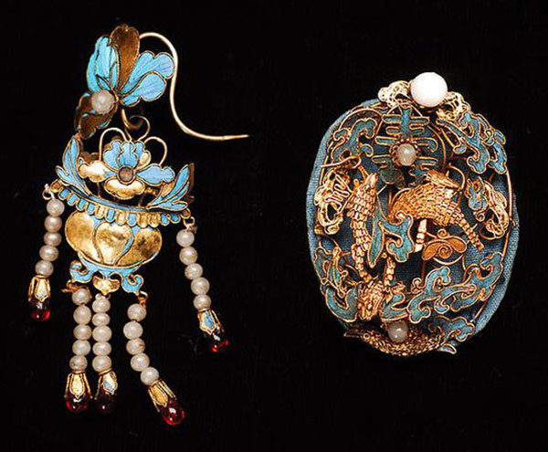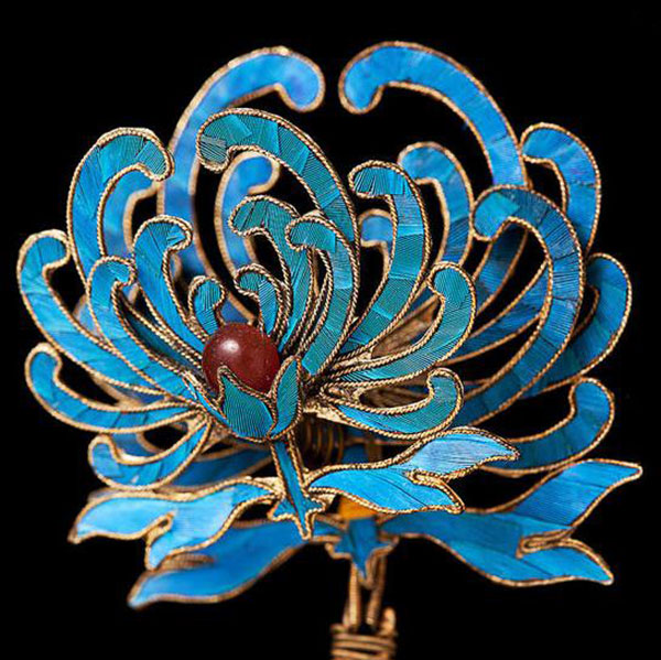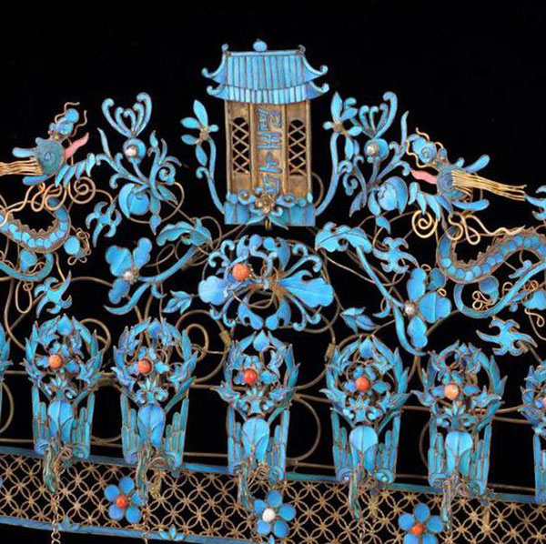 它的制作工艺极为繁杂,制作时先将金、银片按花形制作成一个底托,再用金丝沿着图案花形的边缘焊个槽,在中间部分涂上适量的胶水,将翠鸟的羽毛巧妙地粘贴在金银制成的金属底托上,形成吉祥精美的图案。这些图案上一般还会镶嵌珍珠、翡翠、红珊瑚、玛瑙等宝玉石,越发显得典雅而高贵。