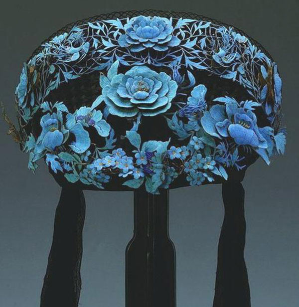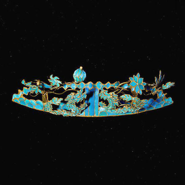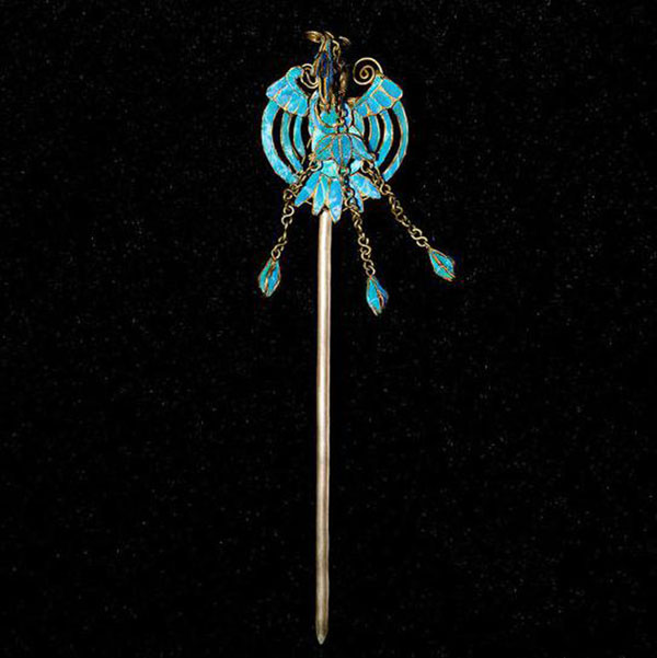 翠鸟毛光泽好颜色鲜亮,再配上金光闪闪的凸边,衬托古代仕女乌黑如云的绣发,犹如幽幽湖水上点点灵动的浮光魅影。然而翠鸟娇小,羽毛柔细,即使制一朵精巧的头花却要牺牲许多美妙的小生灵,因此后世出现了多种仿点翠的饰品。