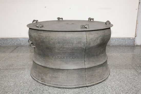 铜鼓,是我国古代人们举行祭祀、战阵、集会、礼仪活动的重要打击乐器,也是贮藏器及殉葬明器。南方铜鼓,形制独特,纹饰繁缛精美,使用时间长,广泛用于南方少数民族。专家学者将铜鼓分为万家坝型、石寨山型、麻将型、遵义型、冷水冲型,北流型、灵山型以及西盟型等类型。广东省博物馆收藏的一面铜鼓就是灵山型铜鼓的代表。