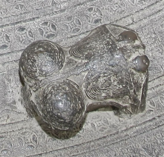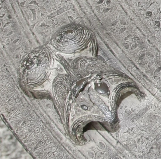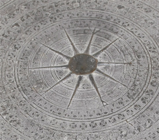 灵山型铜鼓分布在两广交界的云开大山东西两侧,在广东主要在信宜、罗定和高州。它的铸造和使用者,是当时分布在这一区域的西瓯、乌浒和俚人。文中介绍的这面铜鼓出土于广东高要县,身高55厘米,面径97厘米,胸径93.9厘米,腰径84.7厘米,足径97厘米。鼓身呈圆墩形,鼓面沿伸于鼓颈外,鼓胸圆凸,最大径在胸中部。胸腰际缓缓收缩,胸两侧各附双扁耳。耳根宽,中部窄,各饰以五组线纹,简洁秀美。鼓腰呈反弧形,腰与足之间以一道凸棱分界,足外侈。鼓面边缘饰六只青蛙,以逆时针均距排列。青蛙造型精致,双目圆睁,尖嘴,后两足合并成一足,昂首挺立。三足蛙是灵山型铜鼓的特色。蛙身丰肥,饰同心圆纹、复线半圆纹、线纹,纹饰清晰。铜鼓历来以纹饰精美为特点,此鼓鼓面、胸、腰、足部均装饰了繁缛的纹饰。鼓面中心饰浮雕十芒太阳纹,其中心圆饼明显突出鼓面,光芒如针一般从圆饼射出,每隔一芒的尾部分三叉。分叉是灵山型及北流型两种粤式鼓的特点,但并不多见。圆饼之外以双弦纹分晕,共二十晕,芒针穿透三晕。鼓面的二十晕分别饰以钱文、蝉纹、席纹、鸟文、四瓣花纹、图案化鸟形纹等。其中,钱纹有四出钱纹和连钱文,尤其是连钱文,亦呈四出形式,四条射线之间以平行短线填补,相互连接、重叠,互为纹饰的一部分,结构布局安排精巧。此外,还有一些纹饰由于做了图案化的变形和锈蚀的缘故无法清晰辨识。如有的以交错的重线纹或波浪纹与纺锤形纹组合而成;有的以菱形和重线纹、圆圈纹组合成的纹饰仿佛蝉纹,但又别有韵致。这些纹饰虽无法确认其名称,但其精致和巧妙的勾勒与丰富的想象力,令人叹为观止。