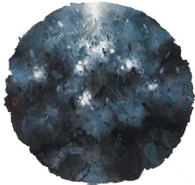 他在画中并不拘泥于具体的荷画莲叶的特征,而追求黄宾虹所谓的“绝似又绝不似物象者”。他以书法性的半抽象笔墨语言,运用密匝的线条、墨点和墨块,加上浑厚的水墨晕渗,营造出幽渺朦胧而又流畅清澈的画面。在春涛浓密厚重的墨色和错综繁杂的线条构成的画面上常常还透露着一丝或一片光亮,或于荷塘深水倒影中,或在远处的地平线上。他以宿墨的苍茫、水色的互融渗化以及白粉的堆砌来达到光感的形成,诱使我们进入他那幽邃、诡秘和忧郁的梦幻世界。这种黑白虚实的处理营造出很强的画面空间张力。他的画面形式语言显然已超脱了传统文人绘画的范式,具有现代绘画强烈的表现性。